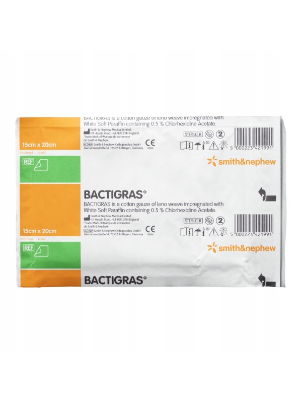 Opatrunek parafinowy firmy Smith&Nephew Bactigras to jałowy opatrunek o specjalnym splocie gazy nasyconym białą, miękką parafiną oraz 0.5% roztworem octanu chlorhexydyny. Opatrunek spełnia rolę bariery pomiędzy raną a opatrunkiem wtórnym, umożliwiającym przepływ wydzieliny do chłonnego opatrunku wtórnego. Antyseptyk octan chlorheksydyny uwalniany stopniowo z opatrunku wywiera długotrwałe działanie przeciwbakteryjne wobec pałeczek Gram-dodatnich i Gram-ujemnych. Zalecany do szerokiego zakresu ran z istniejącym ryzykiem zakażenia lub zakażonych łącznie z ogólnie stosowanymi lekami przeciwbakteryjnymi.
