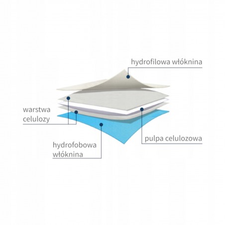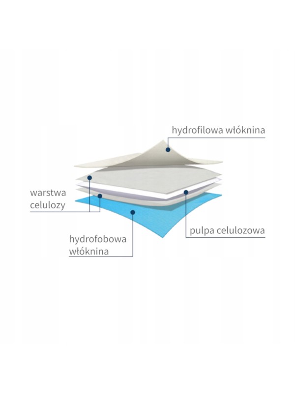 Jałowy kompres wysokochłonny, włókninowo-celulozowy o warstwowej budowie ze zwiększoną zdolnością absorpcyjną.