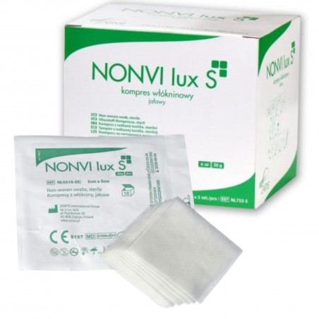 NONVI lux S jałowe kompresy włókninowe, wykonane z miękkiej, chłonnej włókniny o gramaturze 30g/m2.