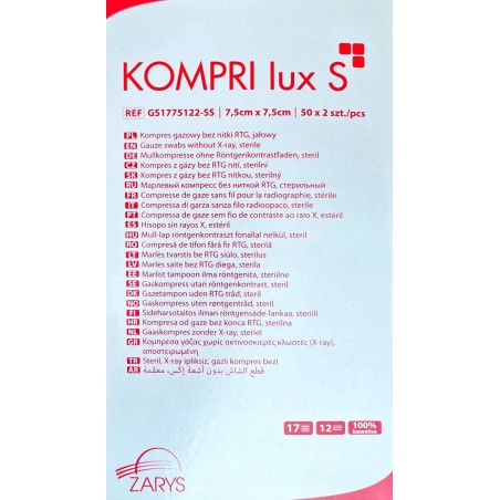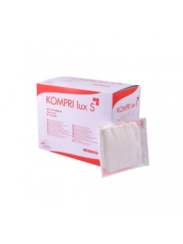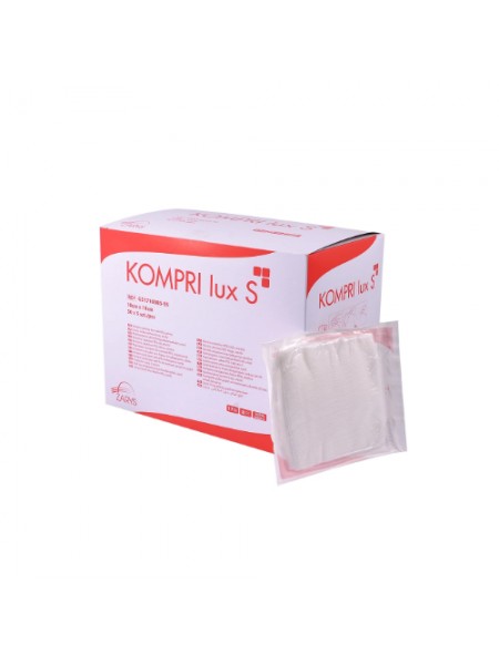 KOMPRI lux S jałowe kompresy z gazy opatrunkowej, wykonane w 100% z miękkiej, hydrofilowej gazy bawełnianej, bielonej metodą bezchlorową z użyciem wody utlenionej.