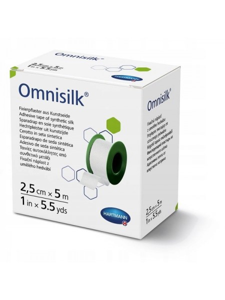 Omnisilk to hipoalergiczny przylepiec z białego sztucznego jedwabiu. Pokryty klejem ze sztucznego kau­czuku naniesionym paskami. Przepuszcza powietrze i parę wodną, nie wywołuje podrażnień skóry. Trzyma pewnie, jednocześnie można go bez­boleśnie usunąć, a po jego zdjęciu nie pozostają resztki kleju. Dzięki ząbkowanym brzegom można go łatwo dzielić nawet w rękawicz­kach.