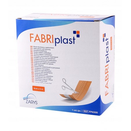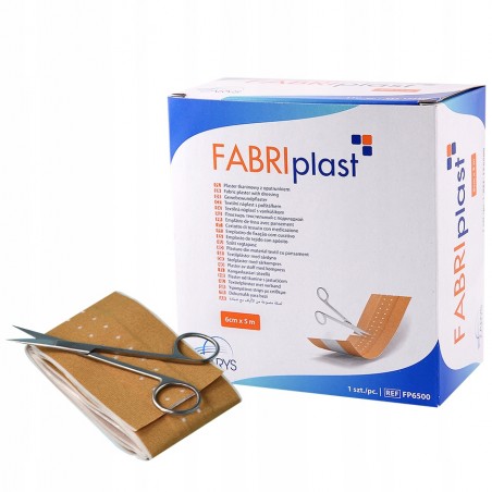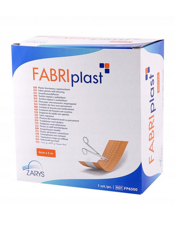 FABRIplast to plaster na tkaninie bawełnianej z opatrunkiem, wykonany w części samoprzylepnej z hydrofobowej tkaniny bawełnianej w kolorze cielisto-brązowym, o dobrej przepuszczalności pary wodnej i powietrza.